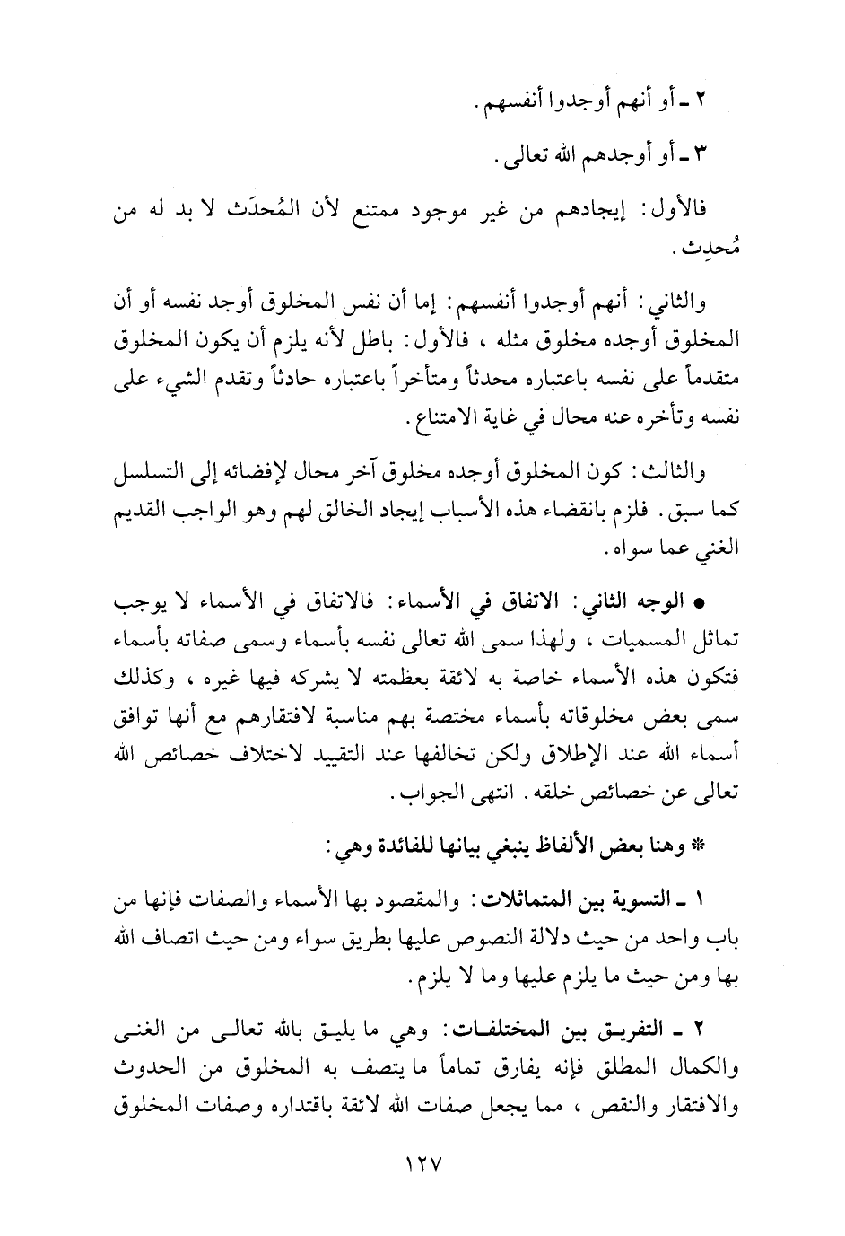 • الوجه الثاني: الاتفاق في الأسماء: فالاتفاق في الأسماء لا يوجب تماثل المسميات، ولهذا سمى الله نفسه بأسماء وسمى صفاته بأسماء فتكون هذه الأسماء خاصة به لائقة بعظمته لا يشركه فيها غيره، وكذلك سمى بعض مخلوقاته بأسماء مختصة بهم مناسبة لافتقارهم مع أنها توافق أسماء الله عند الإطلاق ولكن تخالفها عند التقييد لاختلاف خصائص الله تعالى عن خصائص خلقه. انتهى الجواب.