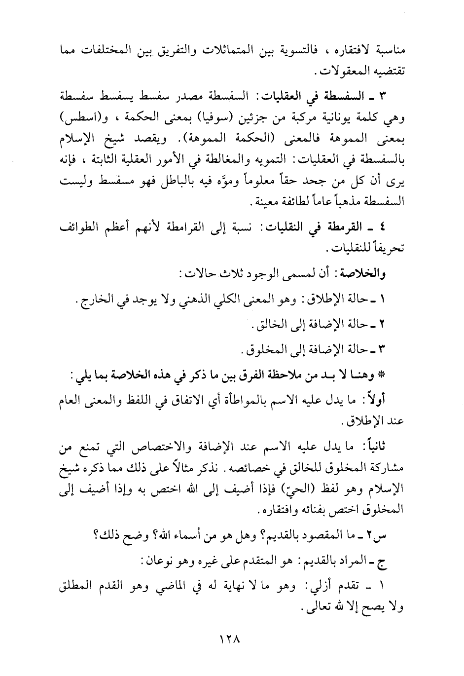 3 ـ السفسطة في العقليات: السفسطة مصدر سفسط يسفسط سفسطة وهي كلمة يونانية مركبة من جزئين (سوفيا) بمعنى الحكمة، و (اسطس) بمعنى المموهة فالمعنى (الحكمة المموهة) . ويقصد شيخ الإسلام بالسفسطة في العقليات: التمويه والمغالطة في الأمور العقلية الثابتة، فإنه يرى أن كل من جحد حقاً معلوماً وموّه فيه بالباطل فهو مسفسط وليست السفسطة مذهباً عاماً لطائفة معينة.