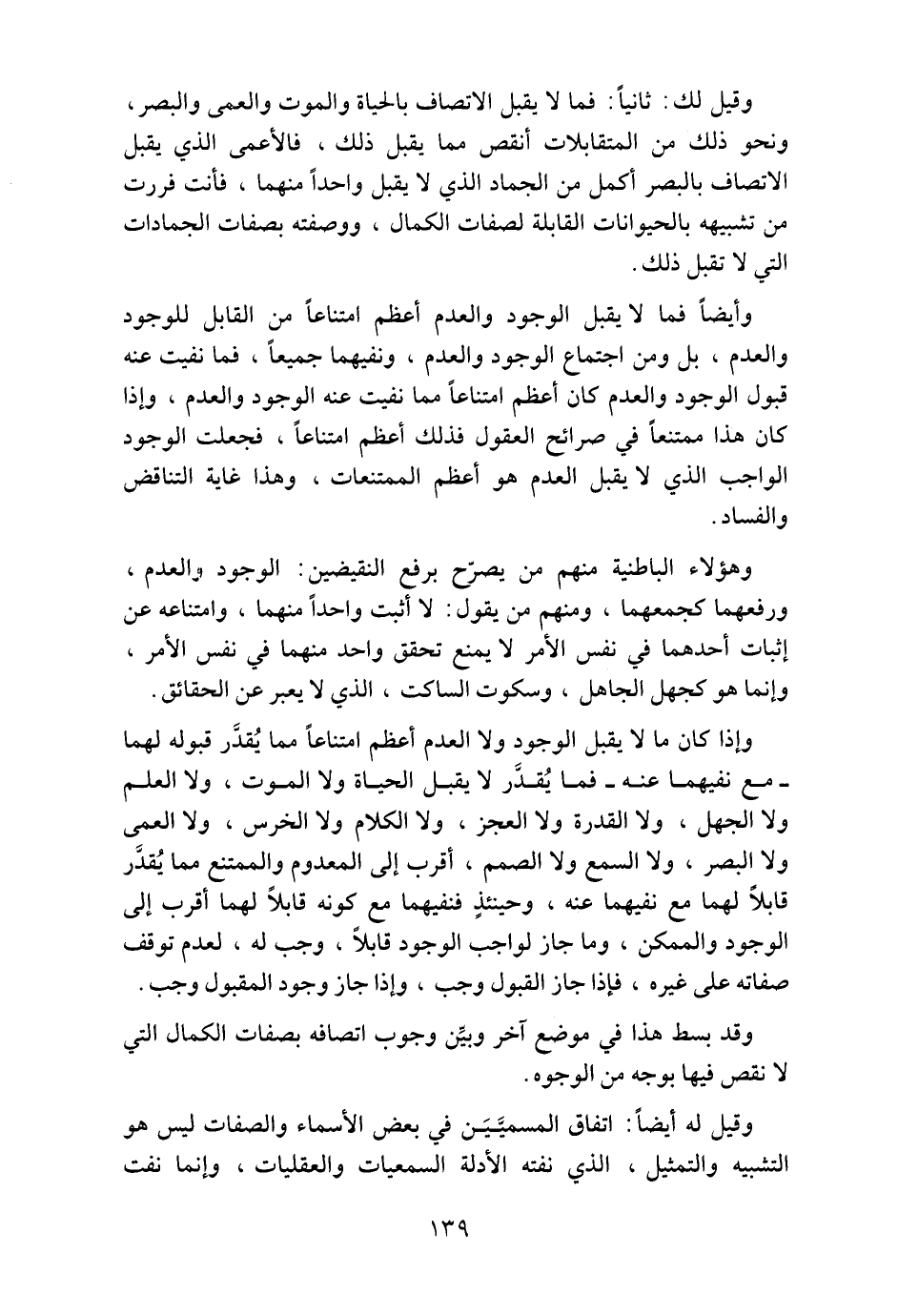 وإذا كان ما لا يقبل الوجود ولا العدم أعظم امتناعاً مما يُقدَّر قبوله لهما ـ مع نفيهما عنه ـ فما يُقدَّر لا يقبل الحياة ولا الموت، ولا العلم ولا الجهل، ولا القدرة ولا العجز، ولا الكلام ولا الخرس، ولا العمى ولا البصر، ولا السمع ولا الصمم، أقرب إلى المعدوم والممتنع مما يُقدَّر قابلاً لهما مع نفيهما عنه، وحينئذٍ فنفيهما مع كونه قابلاً لهما أقرب إلى الوجود والممكن، وما جاز لواجب الوجود قابلاً، وجب له، لعدم توقف صفاته على غيره، فإذا جاز القبول وجب، وإذا جاز وجود المقبول وجب.