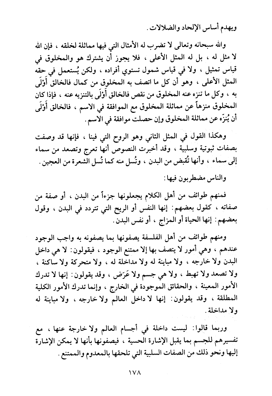 ومهم طوائف من أهل الفلسفة يصفونها بما يصفونه به واجب الوجود عندهم، وهي أمور لا يتصف بها إلا ممتنع الوجود، فيقولون: لا هي داخل البدن ولا خارجه، ولا مباينة له ولا مداخلة له، ولا متحركة ولا ساكنة، ولا تصعد ولا تهبط، ولا هي جسم ولا هي عَرَض، وقد يقولون: إنها لا تدرك الأمور المعينة، والحقائق الموجودة في الخارج، وإنما تدرك الأمور الكلية المطلقة، وقد يقولون: إنها لا داخل العالم ولا خارجه، ولا مباينة له ولا مداخلة.