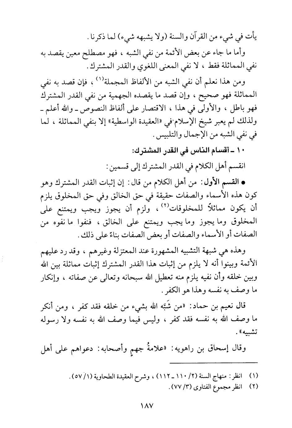 ومن هذا نعلم أن نفي الشبه من الألفاظ المجملة1، فإن قصد به نفي المماثلة فهو صحيح، وإن قصد ما يقصده الجهمية من نفي القدر المشترك فهو باطل، والأولى في هذا، الاقتصار على ألفاظ النصوص ـ والله أعلم ـ ولذلك لم يعبر شيخ الإسلام في (العقيدة الواسطية) إلا بنفي المماثلة، لما في نفي الشبه من الإجمال والتلبيس.