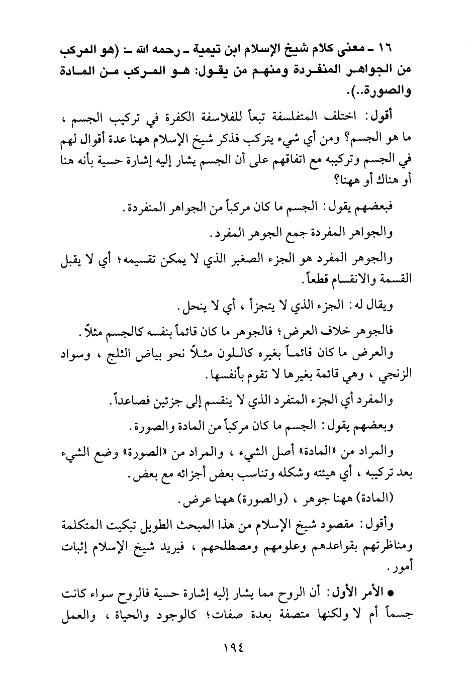 16 ـ معنى كلام شيخ الإسلام ابن تيمية ـ رحمه الله ـ "هو المركب من الجواهر المنفردة ومنهم من يقول: هو المركب من المادة والصورة..".