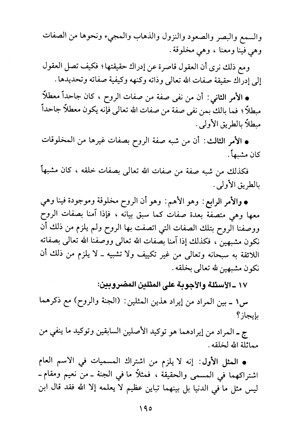 • والأمر الرابع: وهو الأهم: وهو أن الروح مخلوقة وموجودة فينا وهي معها وهي متصفة بعدة صفات كما سبق بيانه، فإذا آمنا بصفات الروح ووصفنا الروح بتلك الصفات التي اتصفت بها الروح ولم يلزم من ذلك أن نكون مشبهين، فكذلك إذا آمنا بصفات الله تعالى ووصفنا الله تعالى بصفاته اللائقة به سبحانه وتعالى من غير تكييف ولا تشبيه ـ لا يلزم من ذلك أن نكون مشبهين الله تعالى بخلقه.