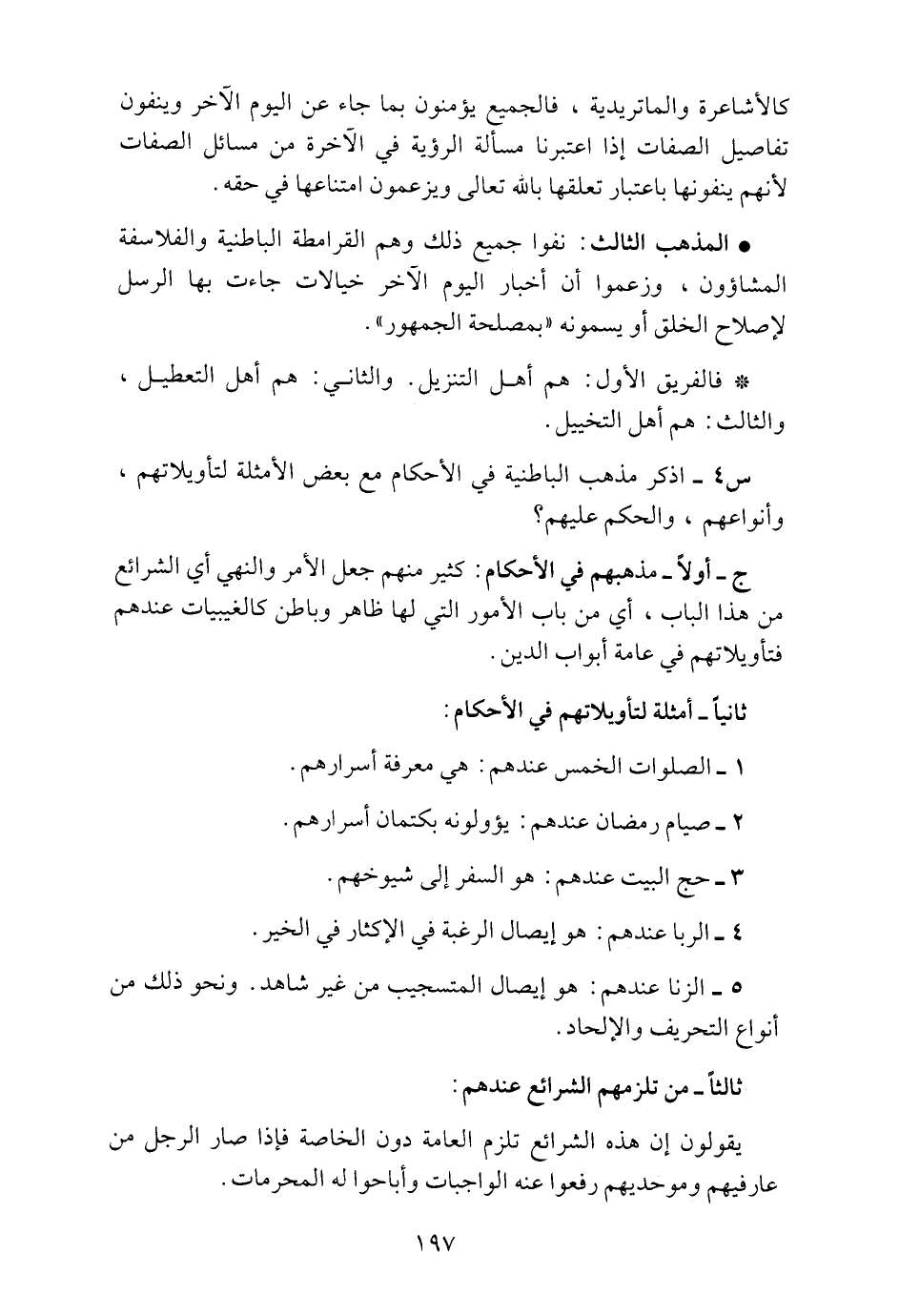 س4 ـ اذكر مذهب الباطنية في الأحكام مع بعض الأمثلة لتأويلاتهم، وأنواعهم، والحكم عليهم؟