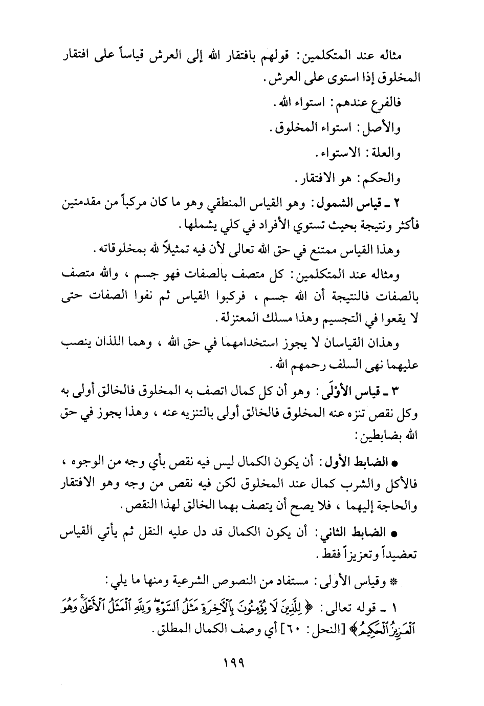 3 ـ قياس الأوْلَى: وهو أن كل كمال اتصف به المخلوق فالخالق أولى به وكل نقص تنزه عنه المخلوق فالخالق أولى بالتنزيه عنه، وهذا يجوز في حق الله بضابطين: