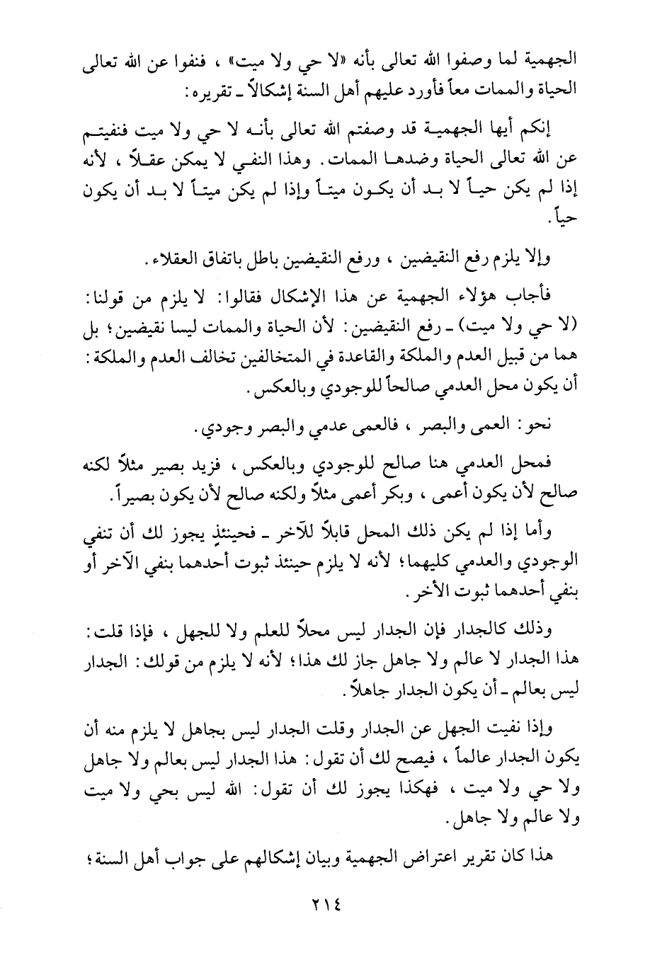 إنكم أيها الجهمية قد وصفتم الله تعالى بأنه لا حي ولا ميت فنفيتم عن الله تعالى الحياة وضدها الممات. وهذا النفي لا يمكن عقلاً، لأنه إذا لم يكن حياً لابد أن يكون ميتاً وإذا لم يكن ميتاً لابد أن يكون حياً.