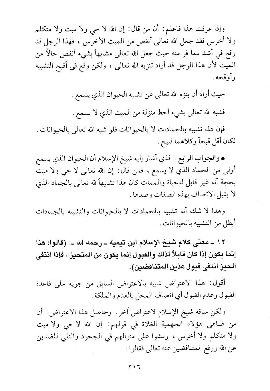12 ـ معنى كلام شيخ الإسلام ابن تيمية ـ رحمه الله ـ: "قالوا: هذه إنما يكون إذا كان قابلاً لذلك والقبول إنما يكون من المتحيز، فإذا انتفى الحيز انتفى قبول هذين المتناقضين".