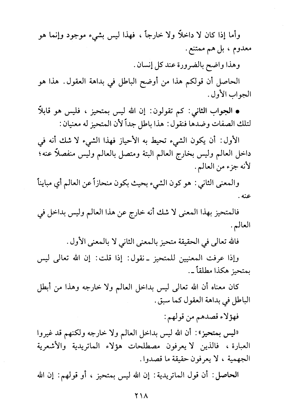 • الجواب الثاني: كم تقولون: إن الله ليس بمتحيز، فليس هو قابلاً لتلك الصفات وضدها فنقول: هذا باطل جداً لأن المتحيز له معنيان: