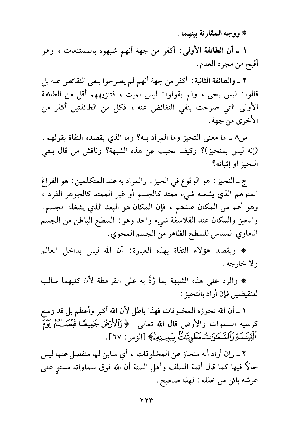 س8 ـ ما معنى التحيز وما المراد به؟ وما الذي يقصده النفاة بقولهم: "إنه ليس بمتحيز"؟ وكيف تجيب عن هذه الشبهة؟ وناقش من قال بنفي التحيز أو إثباته؟