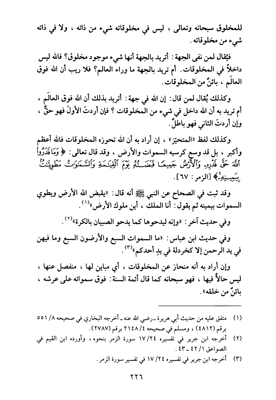 وكذلك لفظ "المتحيِّز"، إن أراد به أن الله تحوزه المخلوقات فالله أعظم وأكبر، بل قد وسع كرسيه السموات والأرض، وقد قال تعالى: {وَمَا قَدَرُوا اللَّهَ حَقَّ قَدْرِهِ وَالْأَرْضُ جَمِيعاً قَبْضَتُهُ يَوْمَ الْقِيَامَةِ وَالسَّمَاوَاتُ مَطْوِيَّاتٌ بِيَمِينِهِ} [الزمر: 67] .