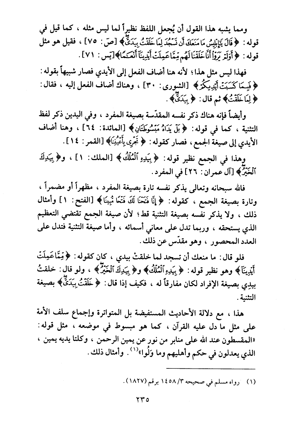 هذا، مع دلالة الأحاديث المستفيضة بل المتواترة وإجماع سلف الأمة على مثل ما دل عليه القرآن، كما هو مبسوط في موضعه، مثل قوله: "المقسطون عند الله على منابر من نور عن يمين الرحمن، وكلتا يديه يمين، الذي يعدلون في حكم وأهليهم وما وَلُوا"1. وأمثال ذلك.