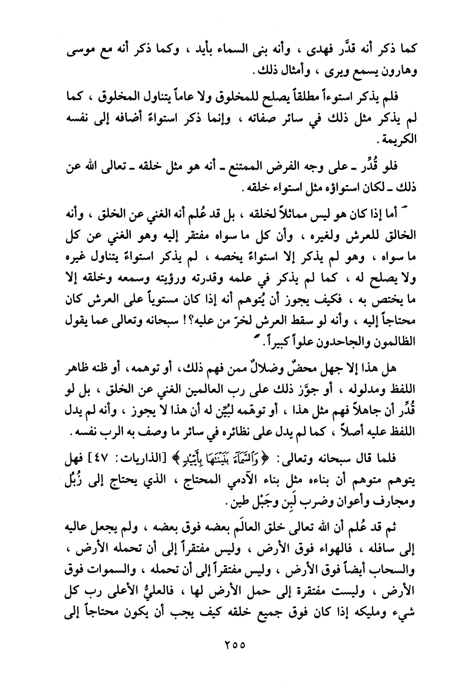 أما إذا كان هو ليس مماثلاً لخلقه، بل قد عُلم أنه الغني عن الخلق، وأنه الخالق للعرش ولغيره، وأن كل ما سواه مفتقر إليه وهو الغني عن كل ما سواه، وهو لم يذكر إلا استواءً يخصه، لم يذكر استواءً يتناول غيره ولا يصلح له، كما لم يذكر في علمه وقدرته ورؤيته وسمعه وخلقه إلا ما يختص به، فكيف يجوز أن يُتوهم أنه إذا كان مستوياً على العرش كان محتاجاً إليه، وأنه لو سقط العرش لخرَّ من عليه؟! سبحانه وتعالى عما يقول الظالمون والجاحدون علواً كبيراً.
