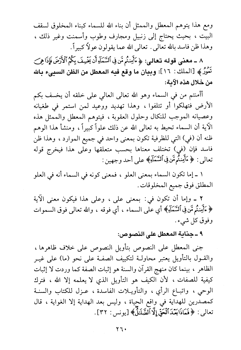 8 ـ معنى قوله تعالى: {أَأَمِنْتُمْ مَنْ فِي السَّمَاءِ أَنْ يَخْسِفَ بِكُمُ الْأَرْضَ فَإِذَا هِيَ تَمُورُ} [الملك: 16] : وبيان ما وقع فيه المعطل من الظن السيئ بالله من خلال هذه الآية: