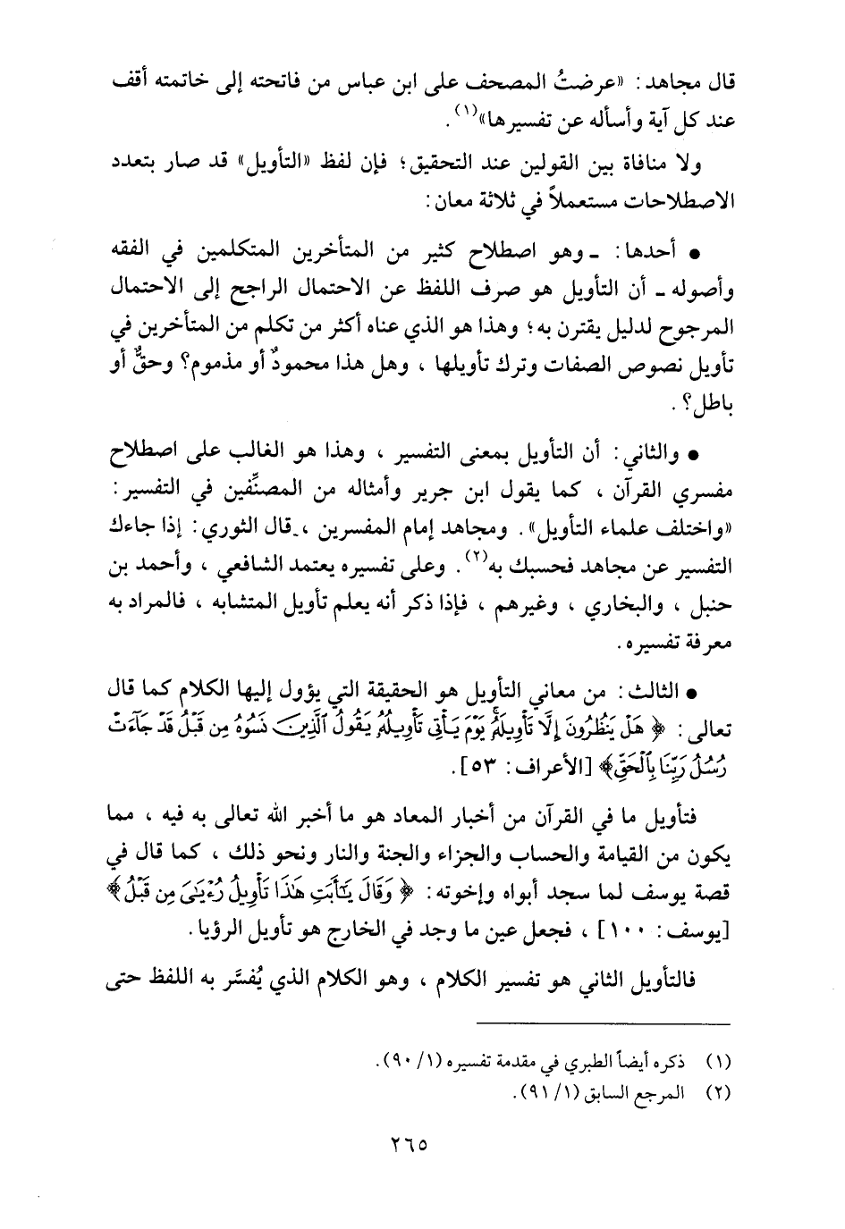 • والثاني: أن التأويل بمعنى التفسير، وهذا هو الغالب على اصطلاح مفسري القرآن، كما يقول ابن جرير وأمثاله المصنِّفين في التفسير: "واختلف علماء التأويل". ومجاهد إمام المفسرين، قال الثوري: إذا جاءك التفسير عن مجاهد فحسبك به2.