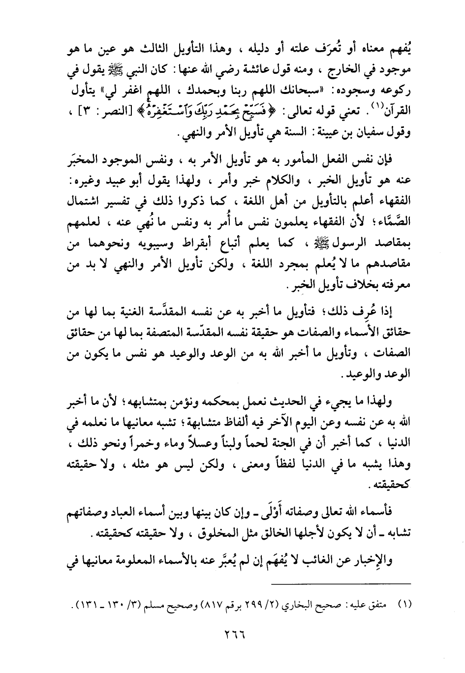 يُفهم معناه أو تُعرَف علته أو دليله، وهذا التأويل الثالث هو عين ما هو موجود في الخارج، ومنه قول عائشة رضي الله عنها: كان النبي صلى الله عليه وسلم يقول في ركوعه وسجوده: "سبحانك اللهم ربنا وبحمدك، اللهم اغفر لي" يتأول القرآن1. تعني قوله تعالى: {فَسَبِّحْ بِحَمْدِ رَبِّكَ وَاسْتَغْفِرْه} [النصر: 3] ، وقول سفيان بن عيينة: السنة هي تأويل الأمر والنهي.