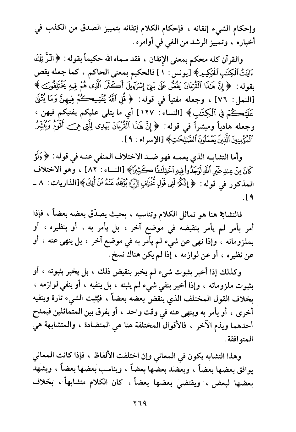 وكذلك إذا أخبر بثبوت شيء لم يخبر بنقيض ذلك، بل يخبر بثبوته، أو بثبوت ملزوماته، وإذا أخبر بنفي شيء لم يثبته، بل ينفيه، أو ينفي لوازمه، بخلاف القول المختلف الذي ينقض بعضه بعضاً، فيُثبت الشيء تارة وينفيه أخرى، أو يأمر به وينهى عنه في وقت واحد، أو يفرق بين المتماثلين فيمدح أحدهما ويذم الآخر، فالأقوال المختلفة هنا هي المتضادة، والمتشابهة هي المتوافقة.