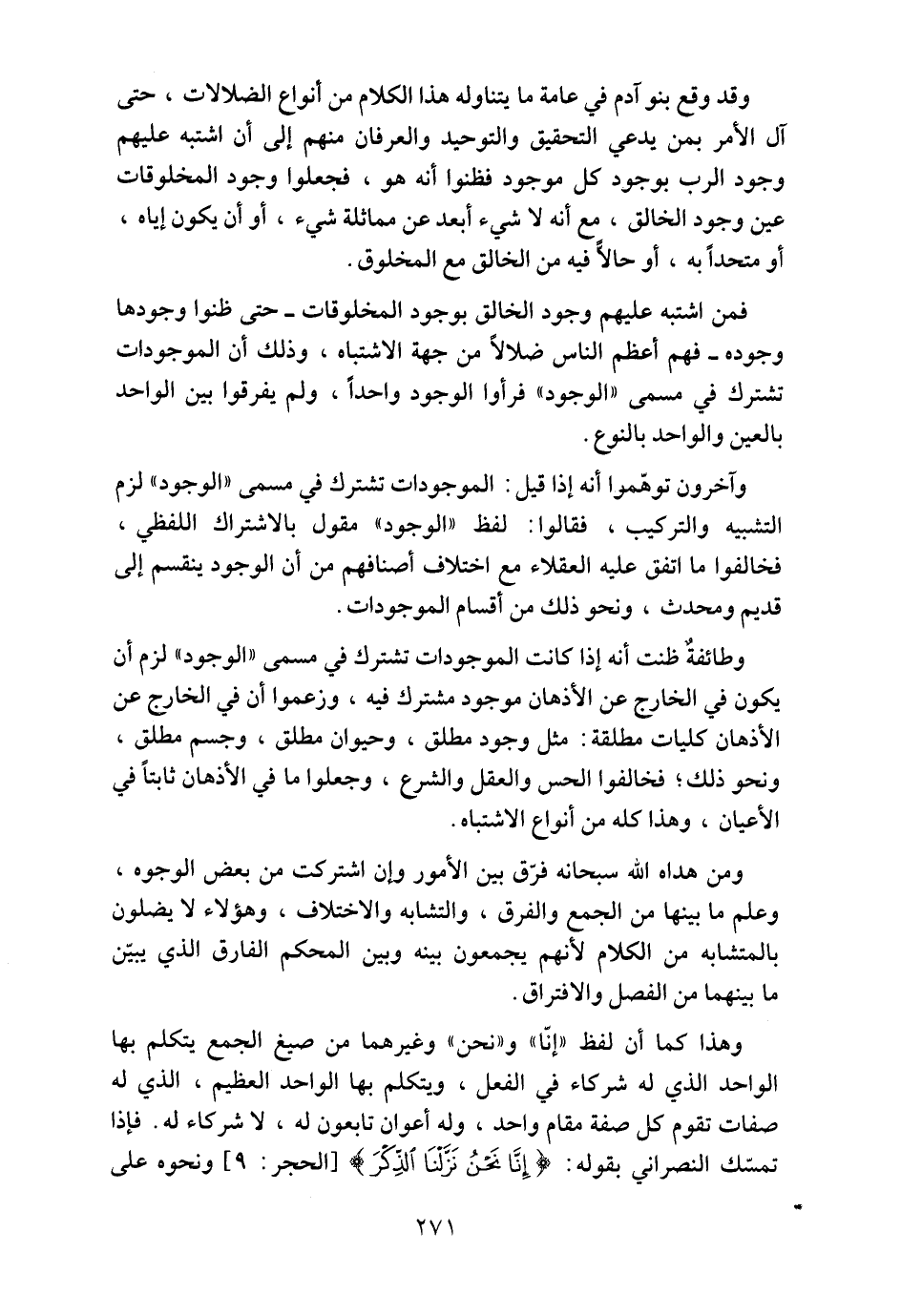 وقد وقع بنو آدم في عامة ما يتناوله هذا الكلام من أنواع الضلالات، حتى آل الأمر بمن يدعي التحقيق والتوحيد والعرفان منهم إلى أن اشتبه عليهم وجود الرب بوجود كل موجود فظنوا أنه هو، فجعلوا وجود المخلوقات عين وجود الخالق، مع أنه لا شيء أبعد عن مماثلة شيء، أو أن يكون إياه، أو متحداً به، أو حالاًّ فيه من الخالق مع المخلوق.