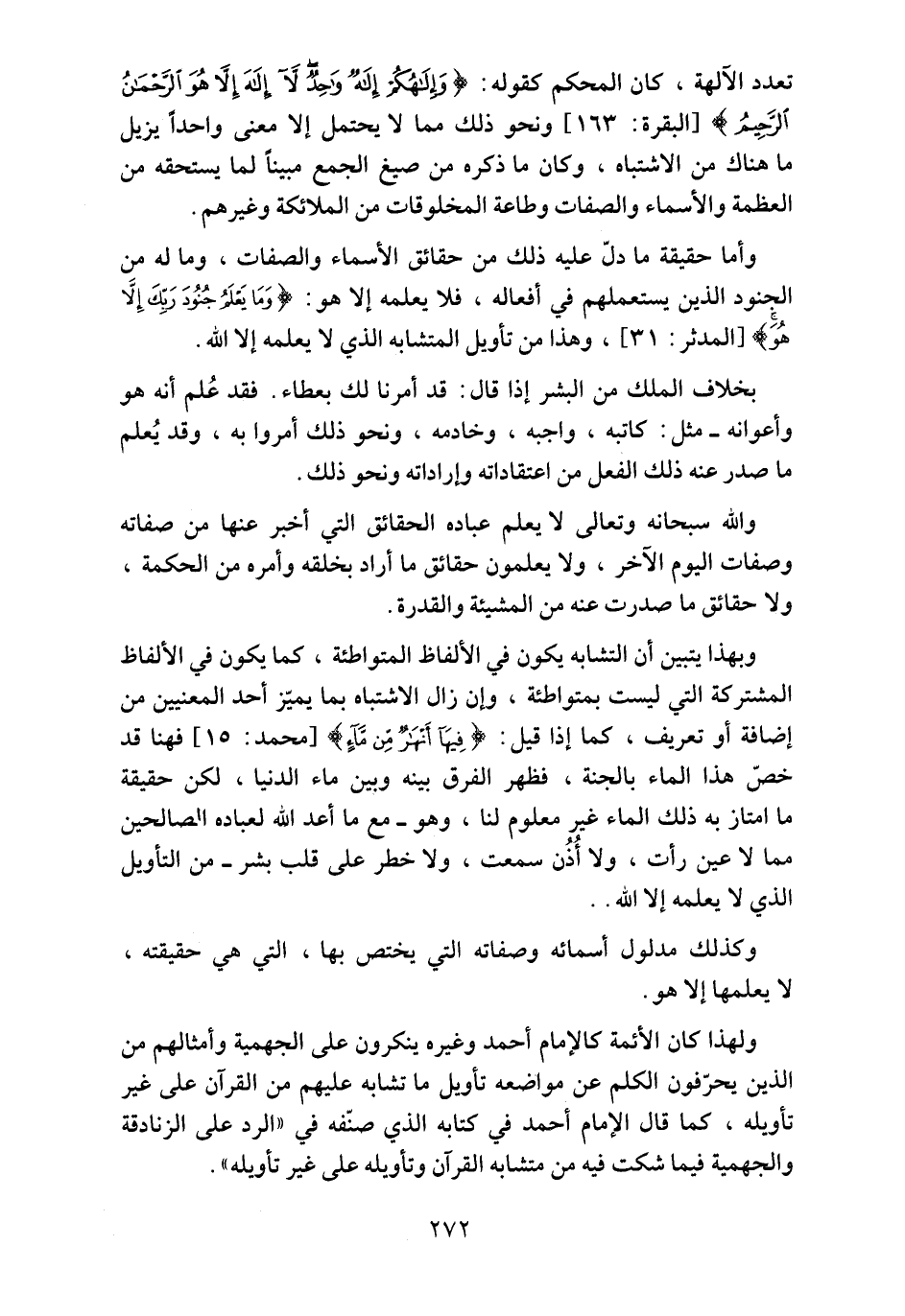 ولهذا كان الأئمة كالإمام أحمد وغيره ينكرون على الجهمية وأمثالهم من الذين يحرفون الكلم عن مواضعه تأويل ما تشابه عليهم من القرآن على غير تأويله، كما قال الإمام أحمد في كتابه الذي صنّفه في "الرد على الزنادقة والجهمية فيما شكت فيه من متشابه القرآن وتأويله على غير تأويله".