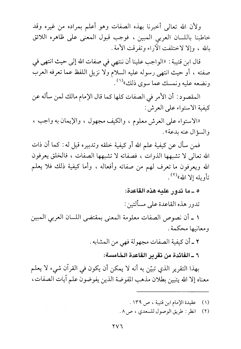 1 ـ أن نصوص الصفات معلومة المعنى بمقتضى اللسان العربي المبين ومعانيها محكمة.