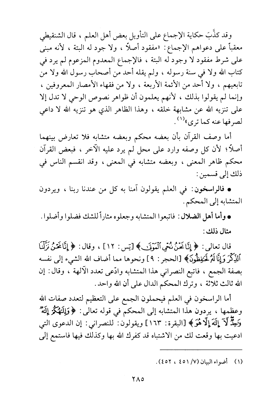 قال تعالى: {إِنَّا نَحْنُ نُحْيِ الْمَوْتَى} [يس: 12] ، وقال: {إِنَّا نَحْنُ نَزَّلْنَا الذِّكْرَ وَإِنَّا لَهُ لَحَافِظُونَ} [الحجر: 9] ونحوها مما أضاف الله الشيء إلى نفسه بصفة الجمع، فاتبع النصراني هذا المتشابه وادعى تعدد الآلهة، وقال: إن الله ثالث ثلاثة، وترك المحكم الدال على أن الله واحد.