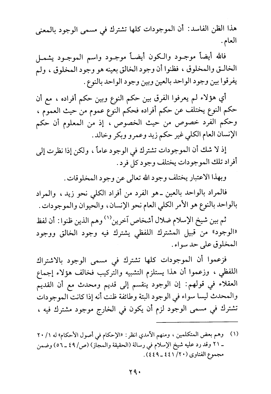 ثم بين شيخ الإسلام ضلال أشخاص آخرين1وهم الذين ظنوا: أن لفظ "الوجود" من قبيل المشترك اللفظي يشترك فيه وجود الخالق ووجود المخلوق على حد سواء.