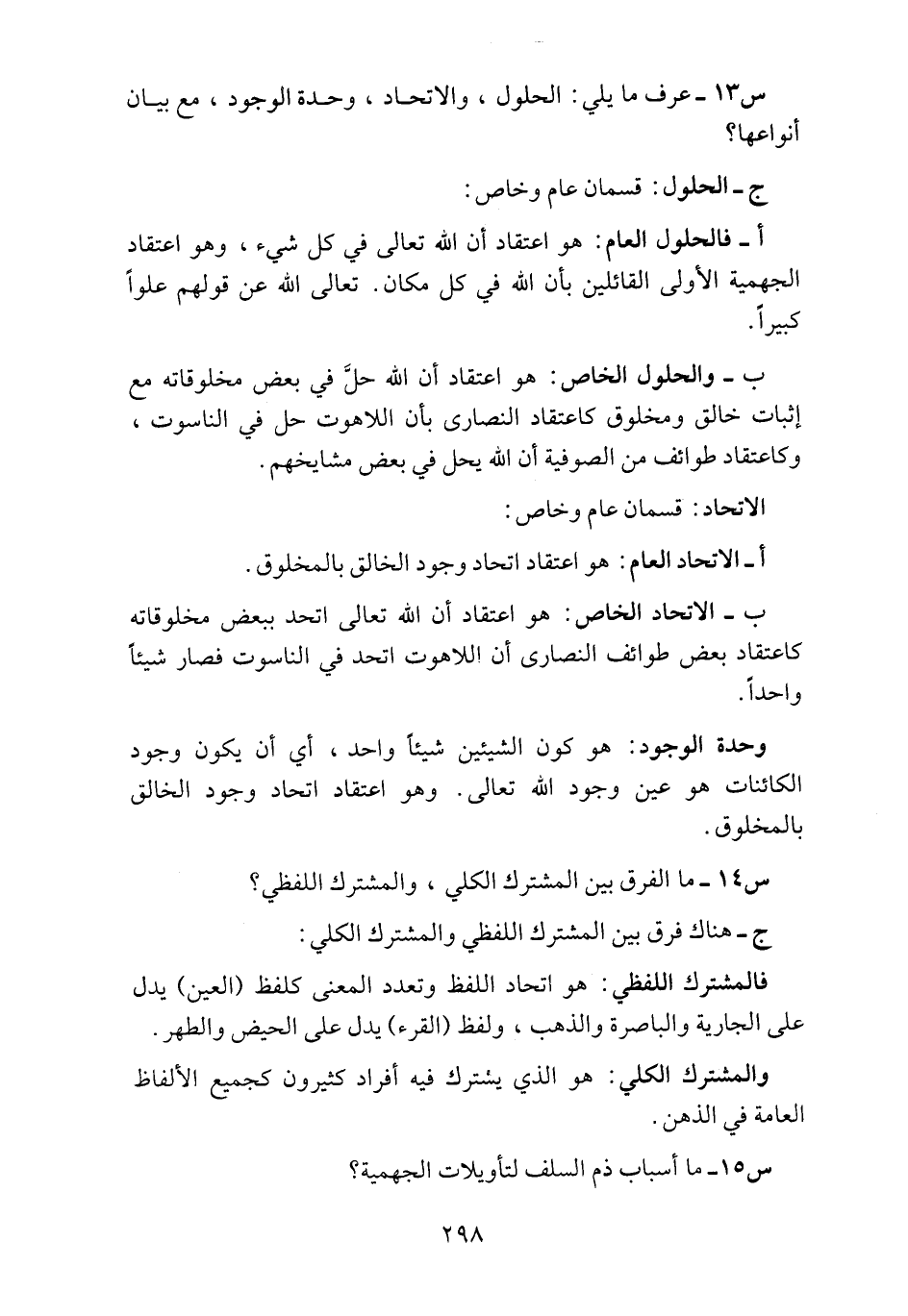 س13 ـ عرف ما يلي: الحلول، والاتحاد، وحدة الوجود، مع بيان أنواعها؟
