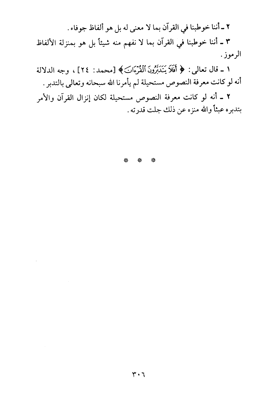 4ـ قال تعالى: {أفَلا يَتَدَبَّرُونَ الْقُرْآنَ} [محمَّد: 24] وجه الدلالة أنه لو كانت معرفة النصوص مستحيلة لم يأمرنا الله سبحانه وتعالى بالتدبر.