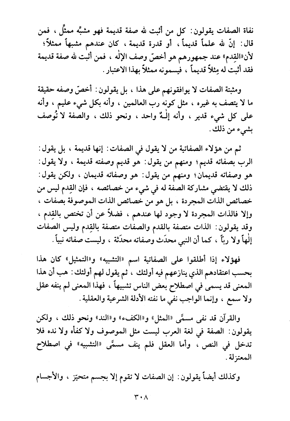 نفاة الصفاة يقولون: كل من أثبت لله صفة قديمة فهو مشبِّه ممثَّل، فمن قال: إنّ لله علماً قديماً، أو قدرة قديمة، كان عندهم مشبهاً ممثلاً؛ لأن "القدم" عند جمهورهم هو أخصّ وصف الإله، فمن أثبت لله صفة قديمة فقد أثبت له مِثلاً قديماً، فيسمونه بهذا الاعتبار.