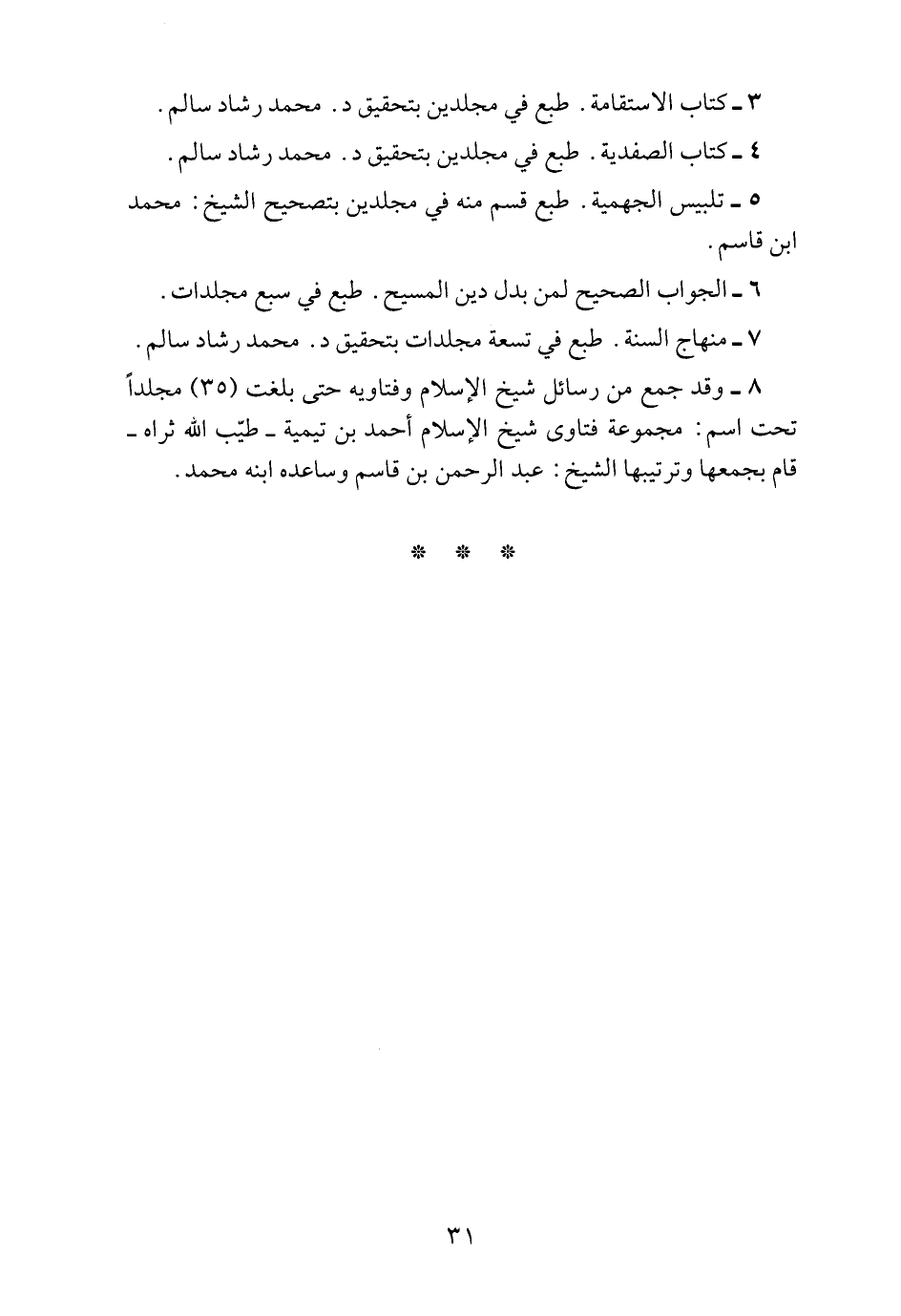 8 ـ وقد جمع من رسائل شيخ الإسلام وفتاويه حتى بلغت (35) مجلداً تحت اسم: مجموعة فتاوى شيخ الإسلام أحمد بن تيمية ـ طيب الله ثراه ـ قام بجمعها وترتيبها الشيخ: عبد الرحمن بن قاسم وساعده ابنه محمد.