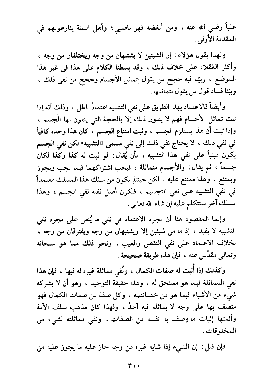وإنما المقصود هنا أن مجرد الاعتماد في نفي ما يُنفى على مجرد نفي التشبيه لا يفيد، إذ ما من شيئين إلا ويشتبهان من وجه ويفترقان من وجه، بخلاف الاعتماد على نفي النقص والعيب، ونحو ذلك مما هو سبحانه وتعالى مقدّس عنه، فإن هذه طريقة صحيحة.