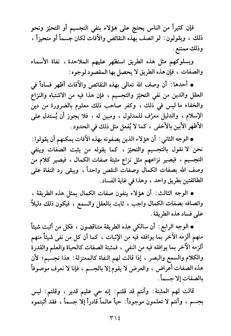 • الو جه الثاني: أن هؤلاء الذين يصفونه بهذه الآفات يمكنهم أن يقولوا: نحن لا نقول بالتجسيم والتحيّز، كما يقوله من يثبت الصفات وينفي التجسيم، فيصير نزاعهم مثل نزاع مثبتة صفات الكمال، فيصير كلام من وصف الله بصفات الكمال وصفات النقص واحداً، ويبقى رد النفاة على الطائفتين بطريق واحد، وهذا في غاية الفساد.