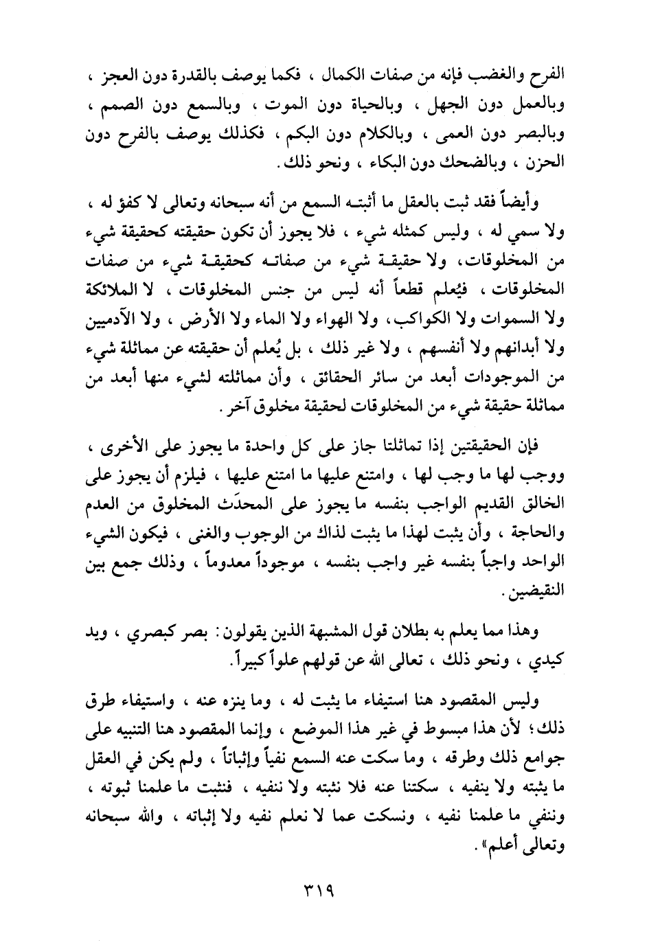 وهذا مما يعلم به بطلان قول المشبهة الذين يقولون: بصر كبصري، ويد كيدي، ونحو ذلك، تعالى الله عن قولهم علواً كبيراً.