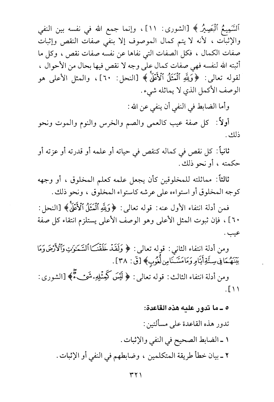 السَّمِيعُ الْبَصِيرُ} [الشورى: 11] ، وإنما جمع الله في نفسه بين النفي والإثبات، لأنه لا يتم كمال الموصوف إلا بنفي صفات النقص وإثبات صفات الكمال، فكل الصفات التي نفاها عن نفسه صفات نقص، وكل ما أثبته الله لنفسه فهي صفات كمال على وجه لا نقص فيها بحال من الأحوال، لقوله تعالى: {وَلِلَّهِ الْمَثَلُ الأعْلَى} [النحل: 60] ، والمثل الأعلى هو الوصف الأكمل الذي لا يماثله شيء.