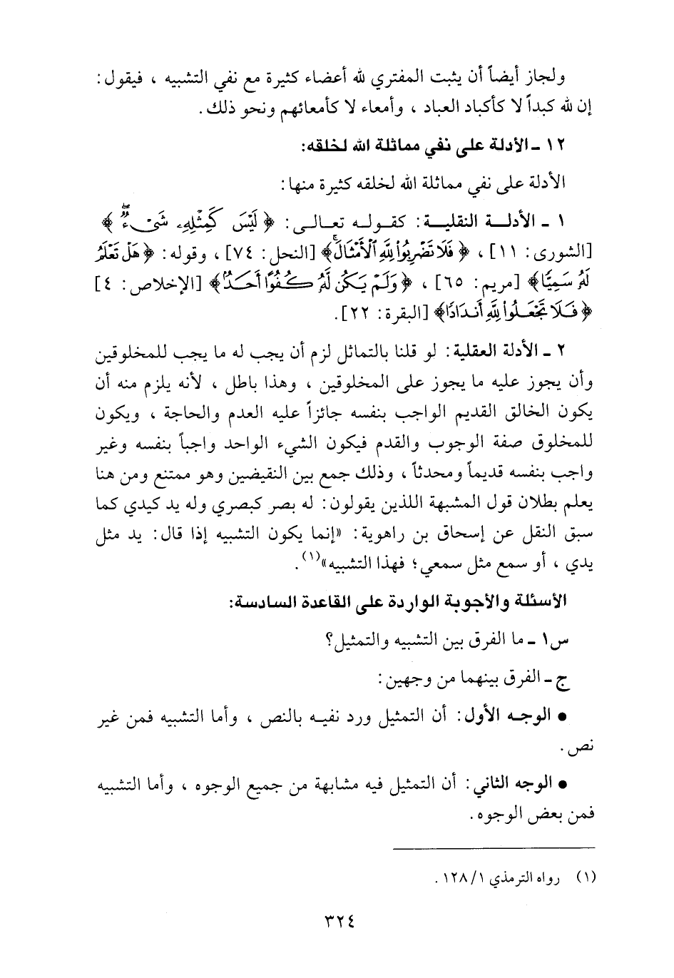 • الوجه الأول: أن التمثيل ورد نفيه بالنص، وأما التشبيه فمن غير نص.