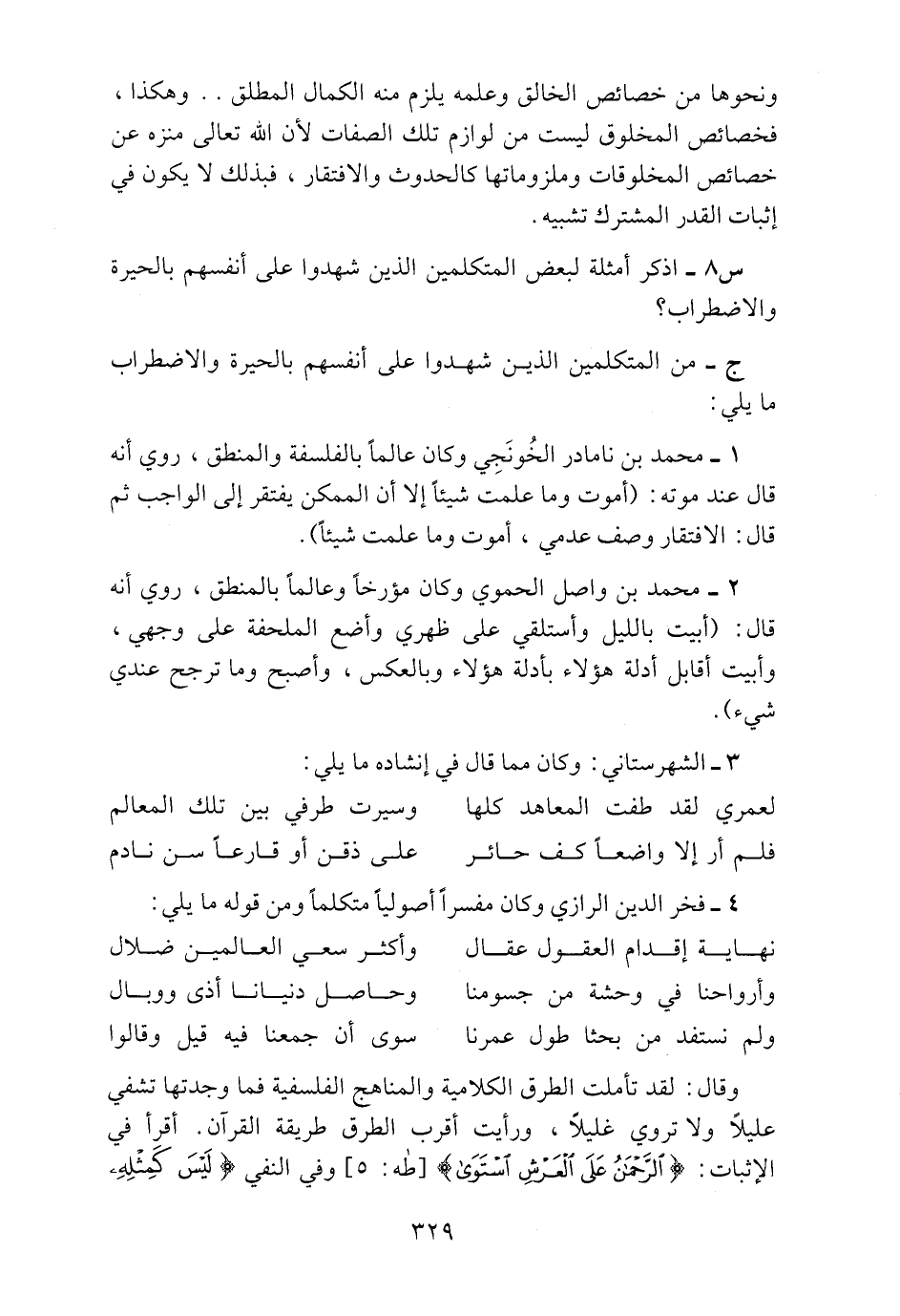 وقال لقد تأملت الطرق الكلامية والمناهج الفلسفية فما وجدتها تشفي عليلاً ولا تروي غليلاً، ورأيت أقرب الطرق طريقة القرآن. أقرأ في الإثبات: {الرَّحْمَنُ عَلَى الْعَرْشِ اسْتَوَى} [طه: 5] وفي النفي {لَيْسَ كَمِثْلِهِ