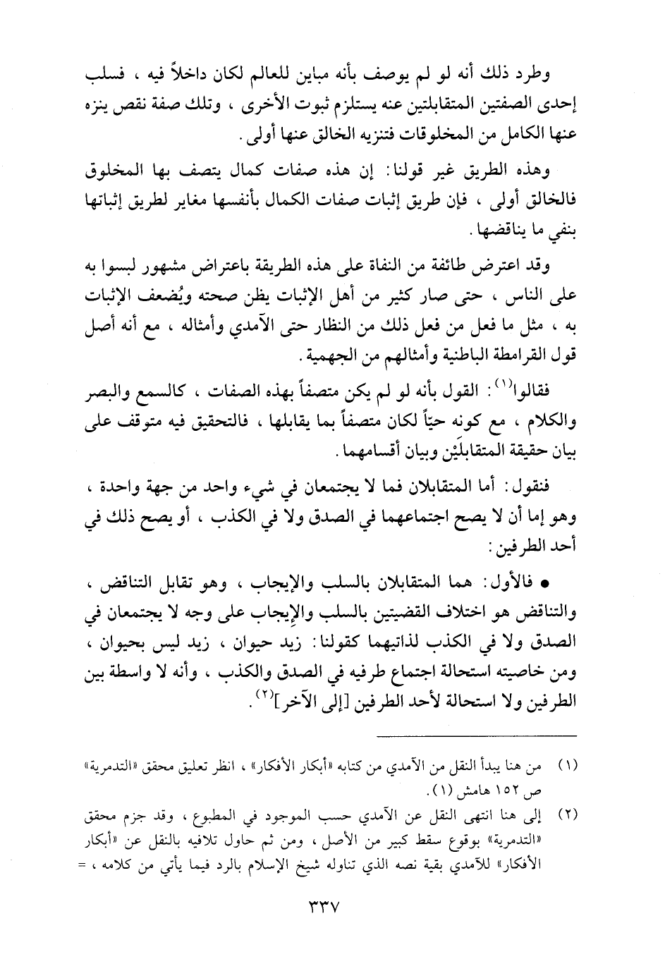 1 من هنا يبدأ النقل من الآمدي من كتابه "أبكار الأفكار"، انظر تعليق محقق "التدمرية" ص 152 هامش (1) .