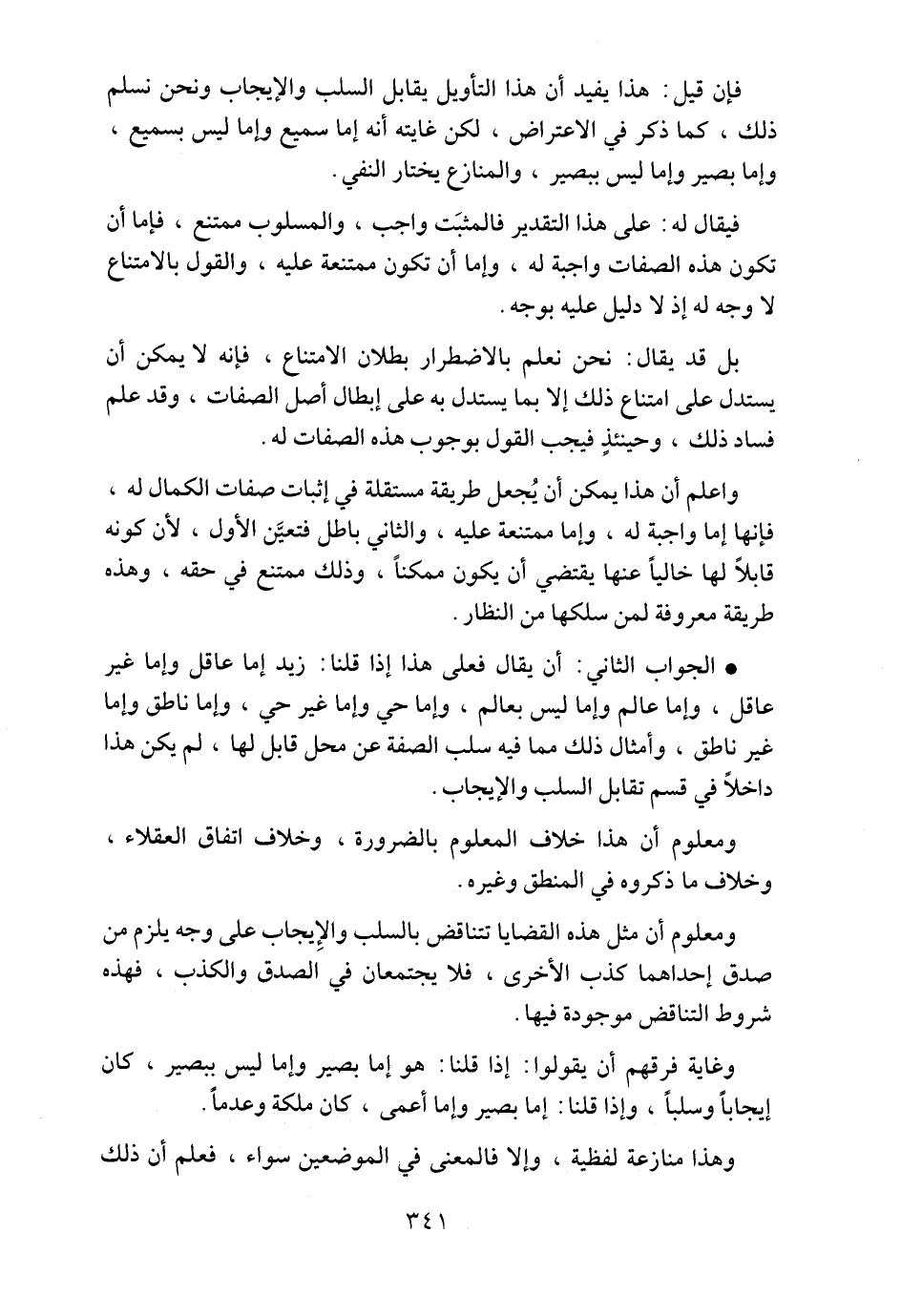 • الجواب الثاني: أن يقال فعلى هذا إذا قلنا: زيد إما عاقل وإما غير عاقل، وإما عالم وإما ليس بعالم، وإما حي وإما غير حي، وإما ناطق وإما غير ناطق، وأمثال ذلك مما فيه سلب الصفة عن محل قابل لها، لم يكن هذا داخلاً في قسم تقابل السلب والإيجاب.