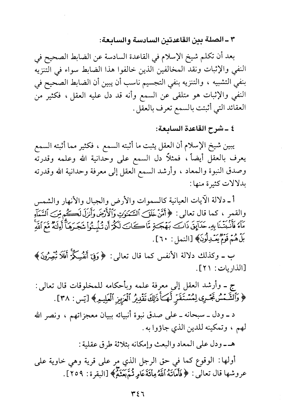 بعد أن تكلم شيخ الإسلام في القاعدة السادسة عن الضابط الصحيح في النفي والإثبات ونقد المخالفين الذين خالفوا هذا الضابط سواء في التنزيه بنفي التجسيم ناسب أن يبين أن الضابط الصحيح في النفي والإثبات هو متلقى عن السمع وأنه قد دل عليه العقل، فكثير من العقائد التي أثبتت بالسمع تعرف بالعقل.