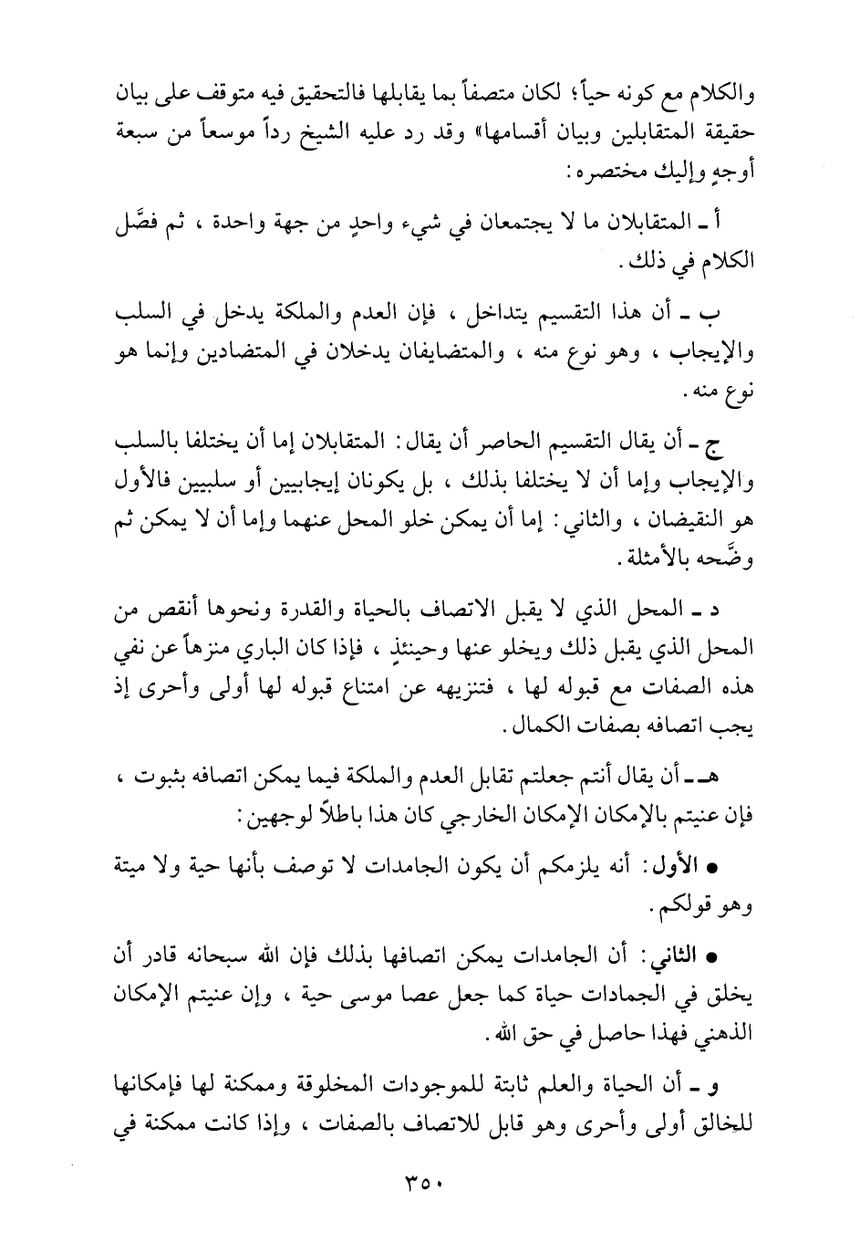 والكلام مع كونه حياً؛ لكان متصفاً بما يقابلها فالتحقيق فيه متوقف على بيان حقيقة المتقابلين وبيان أقسامه" وقد رد عليه الشيخ رداً موسعاً من سبعة أوجهٍ وإليك مختصرة:
