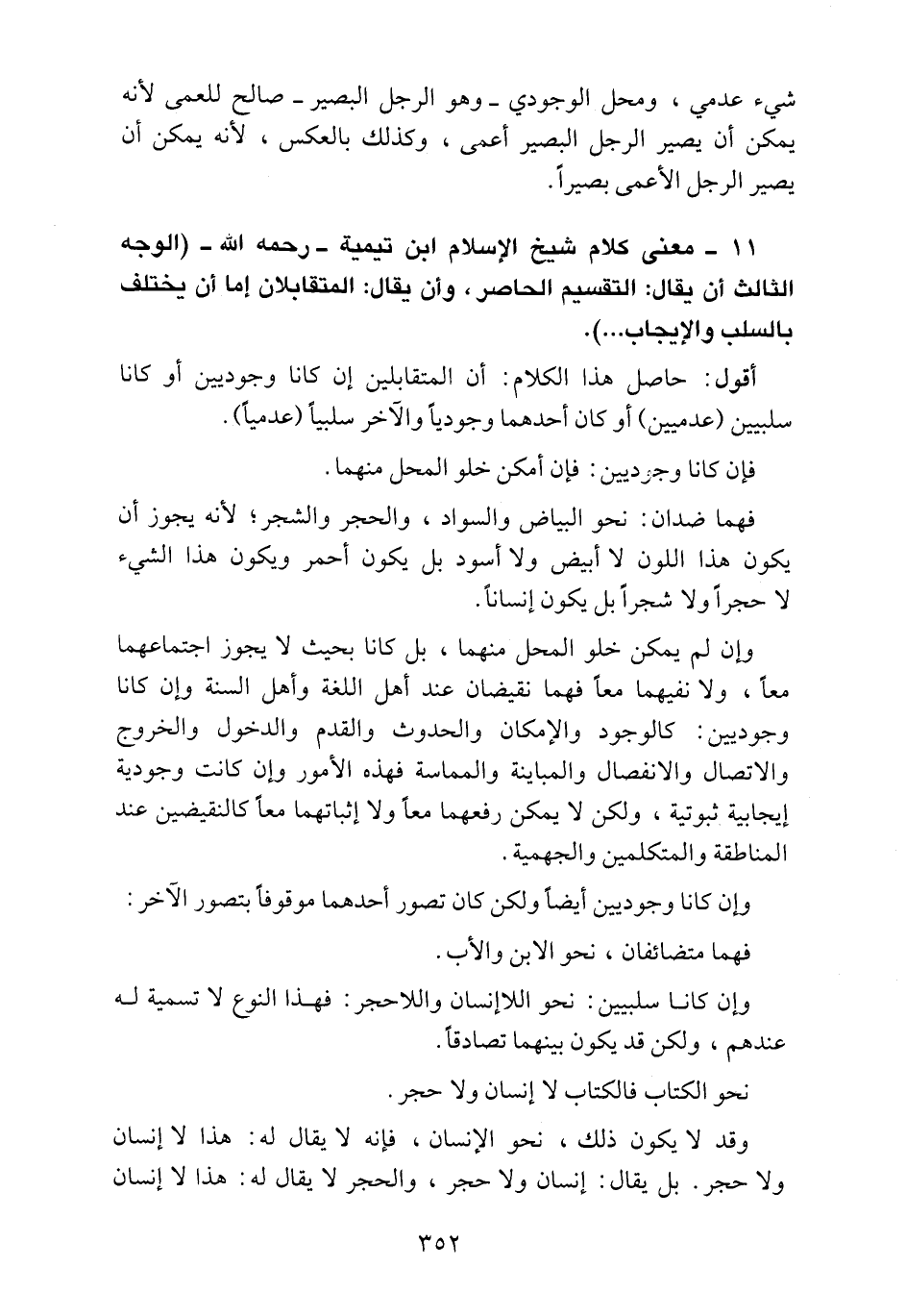 11 ـ معنى كلام شيخ الإسلام ابن تيمية ـ رحمه الله ـ (الوجه الثالث أن يقال: التقسيم الحاصر، وأن يقال: المتقابلان إما أن يختلف بالسلب والإيجاب ... ) .