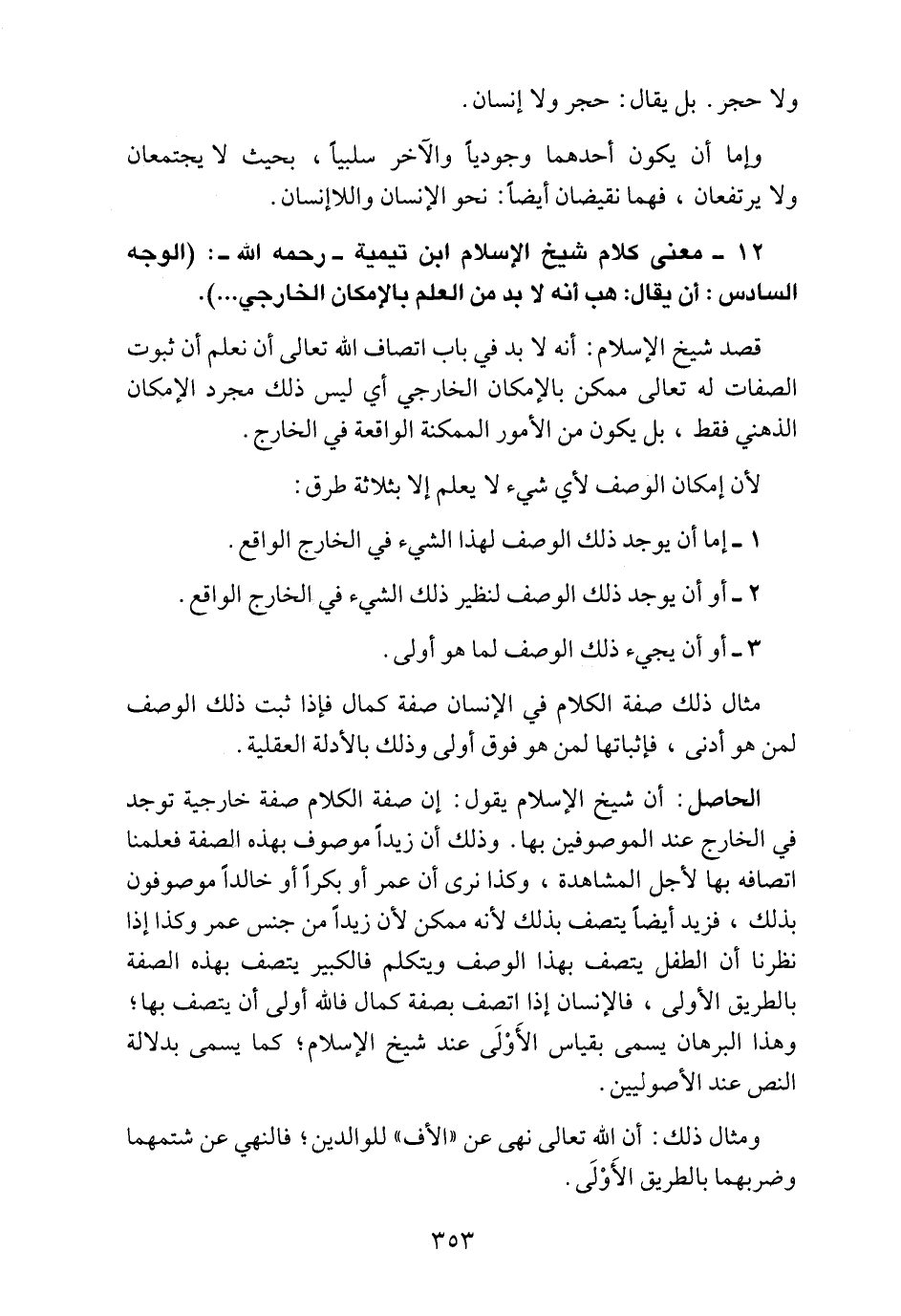 الحاصل: أن شيخ الإسلام يقول: إن صفة الكلام صفة خارجية توجد في الخارج عند الموصوفين بها. وذلك أن زيداً موصوف بهذه الصفة فعلمنا اتصافه بها لأجل المشاهدة، وكذا نرى أن عمراً أو بكراً أو خالداً موصوفون بذلك، فزيد أيضاً يتصف بذلك لأنه ممكن لأن زيداً من جنس عمر وكذا إذا نظرنا أن الطفل يتصف بهذا الوصف ويتكلم فالكبير يتصف بهذه الصفة بالطريق الأولى، فالإنسان إذا اتصف بصفة كمال فالله أولى أن يتصف بها؛ وهذا البرهان يسمى بقياس الأَوْلَى عند شيخ الإسلام؛ كما يسمى بدلالة النص عند الأصوليين.