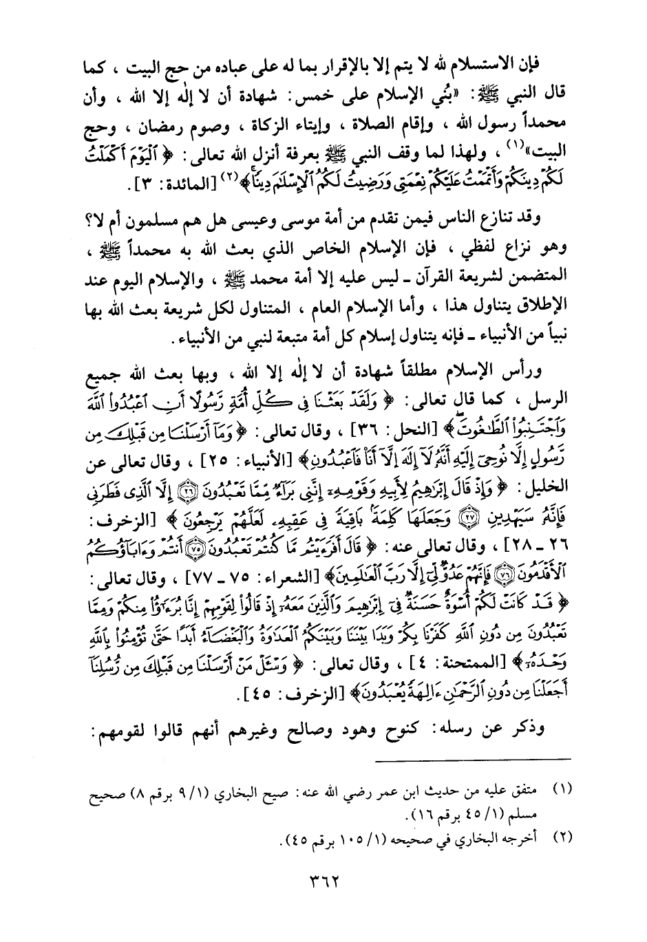 ورأس الإسلام مطلقاً شهادة أن لا إله إلا الله، وبها بعث الله جميع الرسل، كما قال تعالى: {وَلَقَدْ بَعَثْنَا فِي كُلِّ أُمَّةٍ رَسُولاً آنِ اُعْبُدُوا اللَّهَ وَاجْتَنِبُوا الطَّاغُوتَ} [النحل: 36] ، وقال تعالى: {وَمَا أرْسَلْنَا مِنْ قَبْلِكَ مِنْ رَسُولٍ إِلا نُوحِي إِلَيْهِ أنَّهُ لا إِلَهَ إِلا أنَا فَاعْبُدُونِ} [الأنبياء: 25] ، وقال تعالى عن الخليل: {وَإِذْ قَالَ إِبْرَاهِيمُ لأبِيهِ وَقَوْمِهِ إِنَّنِي بَرَاءٌ مِمَّا تَعْبُدُونَ * إِلا الَّذِي فَطَرَنِي فَإِنَّهُ سَيَهْدِينِ * وَجَعَلَهَا كَلِمَةً بَاقِيَةً فِي عَقِبِهِ لَعَلَّهُمْ يَرْجِعُونَ} [الزخرف: 26ـ 28] ، وقال تعالى عنه: {قَالَ أفَرَأيْتُمْ مَا كُنْتُمْ تَعْبُدُونَ * أنْتُمْ وَآبَاؤُكُمُ الأقْدَمُونَ * فَإِنَّهُمْ عَدُوٌّ لِي إِلا رَبَّ الْعَالَمِينَ} [الشعراء: 75ـ 77] وقال تعالى: {قَدْ كَانَتْ لَكُمْ أُسْوَةٌ حَسَنَةٌ فِي إِبْرَاهِيمَ وَالَّذِينَ مَعَهُ إِذْ قَالُوا لِقَوْمِهِمْ إِنَّا بُرَآءُ مِنْكُمْ وَمِمَّا تَعْبُدُونَ مِنْ دُونِ اللَّهِ كَفَرْنَا بِكُمْ وَبَدَا بَيْنَنَا وَبَيْنَكُمُ الْعَدَاوَةُ وَالْبَغْضَاءُ أبَدًا حَتَّى تُؤْمِنُوا بِاللَّهِ وَحْدَهُ} [الممتحنة:4] ، وقال تعالى: {وَاسْأَلْ مَنْ أرْسَلْنَا مِنْ قَبْلِكَ مِنْ رُسُلِنَا أجَعَلْنَا مِنْ دُونِ الرَّحْمَنِ آلِهَةً يُعْبَدُونَ} [الزخرف: 45] .