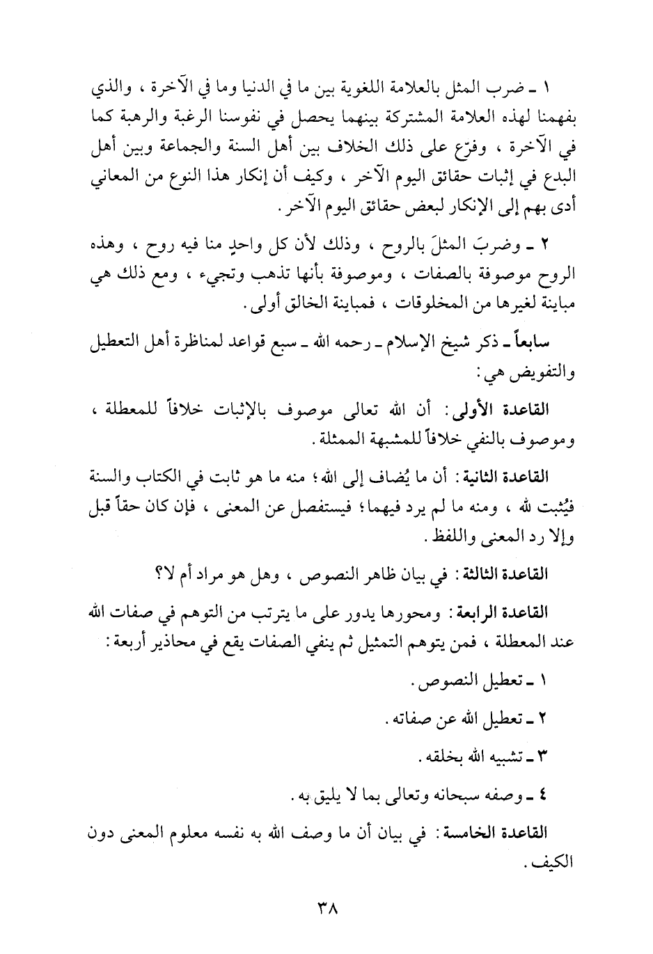 القاعدة الرابعة: ومحورها يدور على ما يترتب من التوهم في صفات الله عند المعطلة فمن يتوهم التشبيه ثم ينفي الصفات يقع في محاذير أربعة: