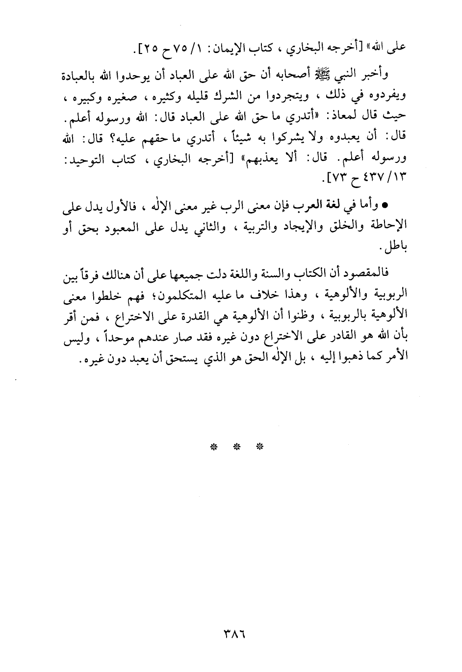 فالمقصود أن الكتاب والسنة واللغة دلت جميعها على أن هنالك فرقاً بين الربوبية والألوهية، وهذا خلاف ما عليه المتكلمون؛ فهم خلطوا معنى الألوهية بالربوبية، وظنوا أن الألوهية هي القدرة على الاختراع دون غيره فقد صار عندهم موحداً، وليس الأمر كما ذهبوا إليه، بل الإله الحق هو الذي يستحق أن يعبد دون غيره.