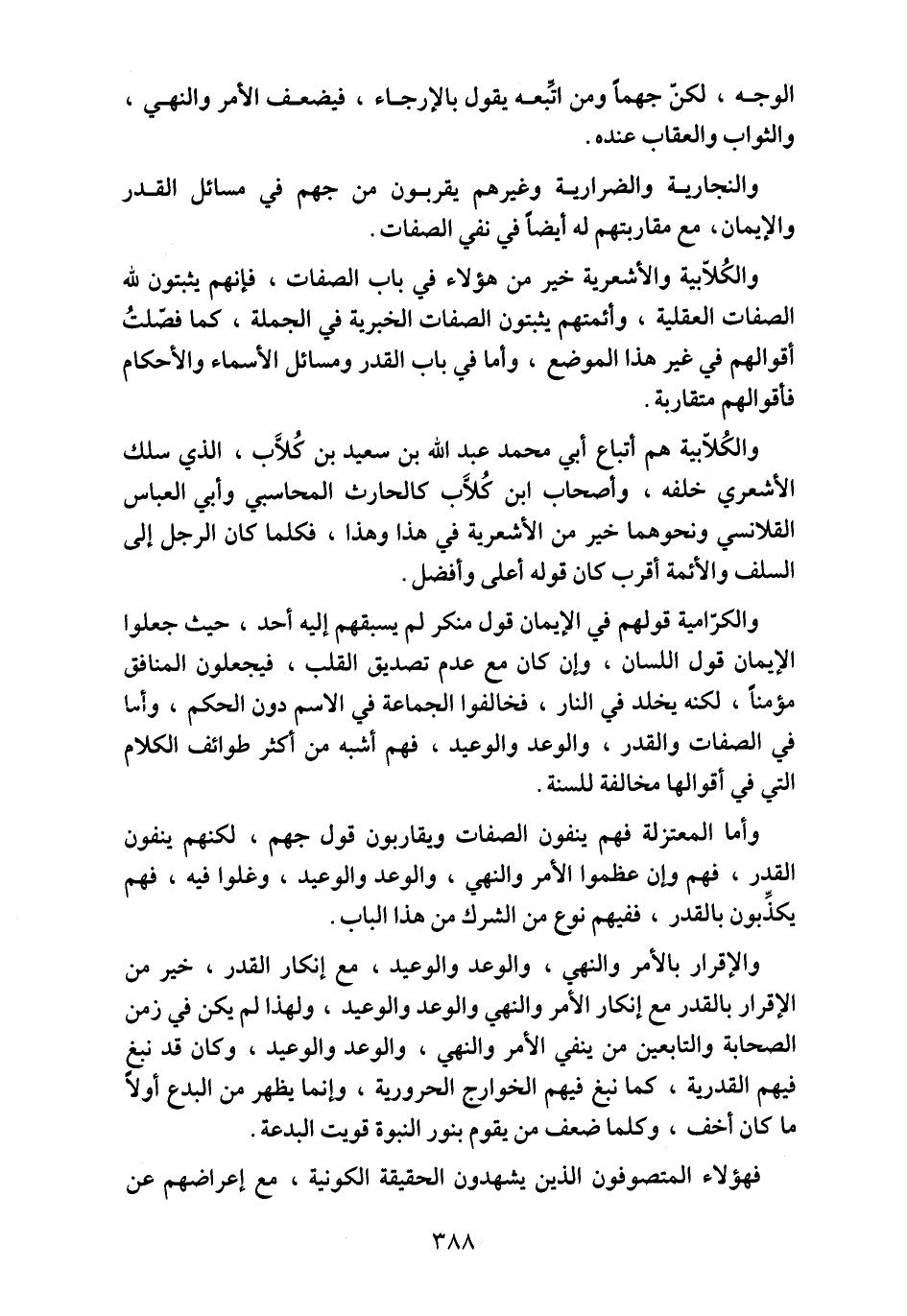 والكُلاّبية والأشعرية خير من هؤلاء في باب الصفات، فإنهم يثبتون لله الصفات العقلية، وأئمتهم يثبتون الصفات الخبرية في الجملة، كما فصّلتُ أقوالهم في غير هذا الموضع، وأما في باب القدر ومسائل الأسماء والأحكام فأقوالهم متقاربة.