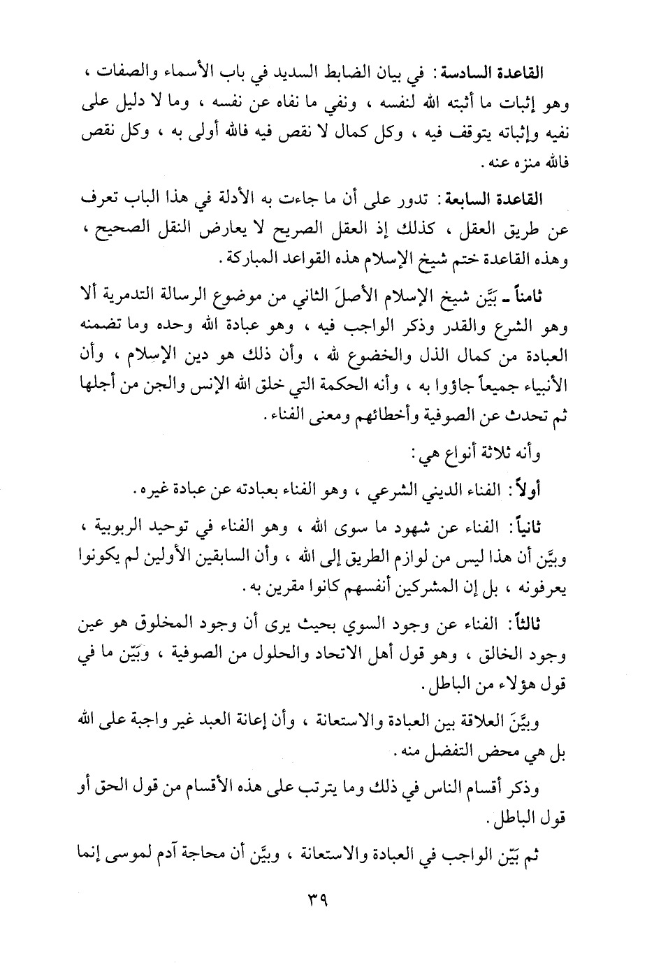 ثامناً ـ بَيَّن شيخ الإسلام الأصلَ الثاني من موضوع الرسالة التدمرية ألا وهو الشرع والقدر وذكر الواجب فيه، وهو عبادة الله وحده وما تضمنه العبادة من كمال الذل والخضوع لله، وأن ذلك هو دين الإسلام وأن الأنبياء جميعاً جاؤوا به، وأنه الحكمة التي خلق الله الإنس والجن من أجلها ثم تحدث عن الصوفية وأخطائهم ومعنى الفناء.