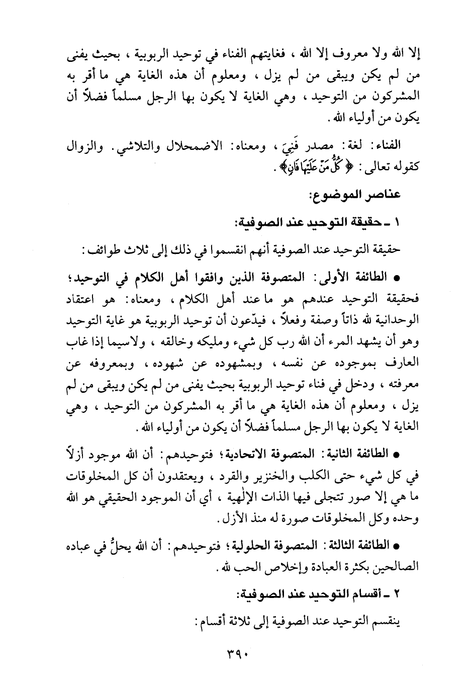• الطائفة الأولى: المتصوفة الذين وافقوا أهل الكلام في التوحيد؛ فحقيقة التوحيد عندهم هو ما عند أهل الكلام، ومعناه: هو اعتقاد الوحدانية لله ذاتاً وصفة وفعلاً، فيدّعون أن توحيد الربوبية هو غاية التوحيد وهو أن يشهد المرء أن الله رب كل شيء ومليكه وخالقه، ولا سيما إذا غاب العرف بموجوده عن نفسه، وبمشهوده عن شهوده، وبمعروفه عن معرفته، ودخل في فناء توحيد الربوبية بحيث يفنى من لم يكن ويبقى من لم يزل، ومعلوم أن هذه الغاية هي ما أقر به المشركون من التوحيد، وهي الغاية لا يكون بها الرجل مسلماً فضلاً أن يكون من أولياء الله.
