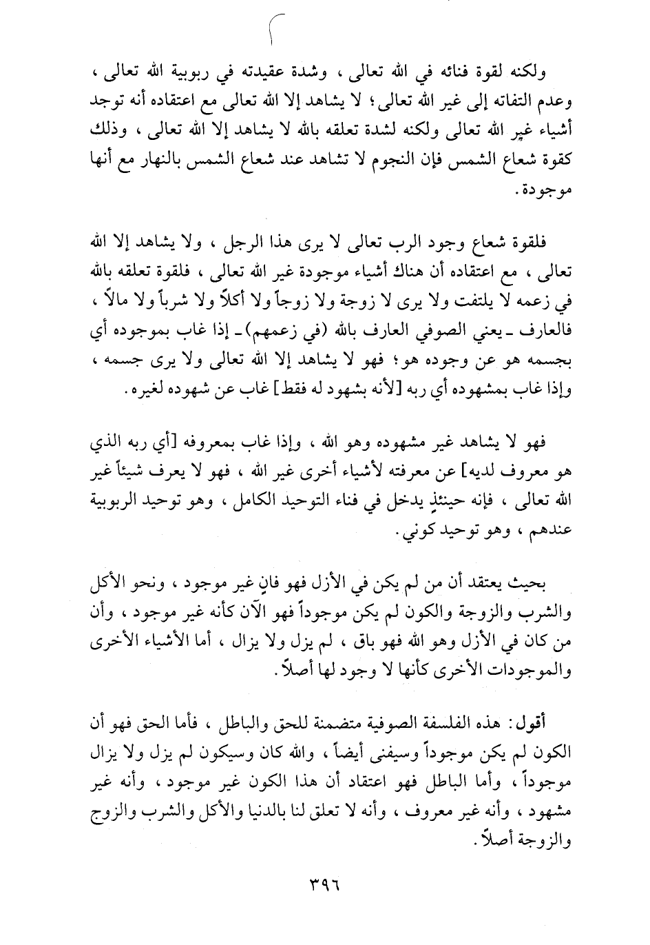 ولكنه لقوة فنائه في الله تعالى، وشدة عقيدته في ربوبية الله تعالى، وعدم التفاته إلى غير الله تعالى؛ لا يشاهد إلا الله تعالى مع اعتقاده أنه توجد أشياء غير الله تعالى ولكنه لشدة تعلقه بالله لا يشاهد إلا الله تعالى، وذلك كقوة شعاع الشمس فإن النجوم لا تشاهد عند شعاع الشمس بالنهار مع أنها موجود.