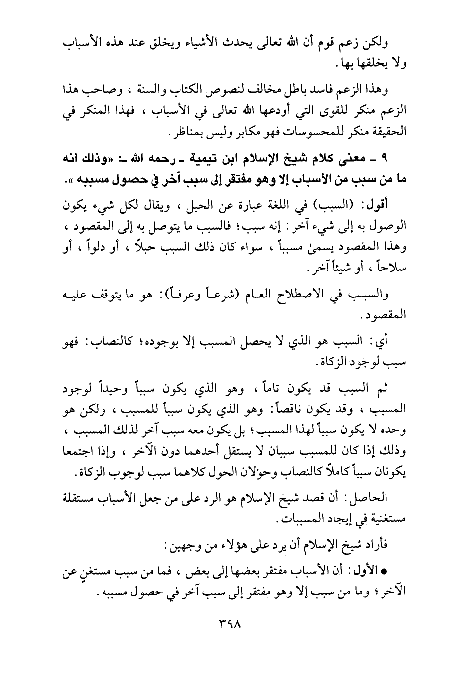 9 ـ معنى كلام شيخ الإسلام ابن تيمية ـ رحمه الله ـ " وذلك أنه ما من سبب من الأسباب إلا وهو مفتقر إلى سبب آخر في حصول مسببه".
