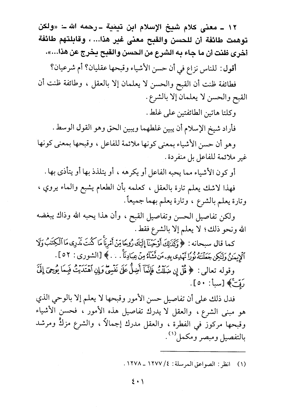 12 ـ معنى كلام شيخ الإسلام ابن تيمية ـ رحمه الله ـ "ولكن توهمت طائفة أن للحسن والقبح معنى غير هذا ... ، وقابلتهم طائفة أخرى ظنت أن ما جاء به الشرع من الحسن والقبح يخرج عن هذا ... "